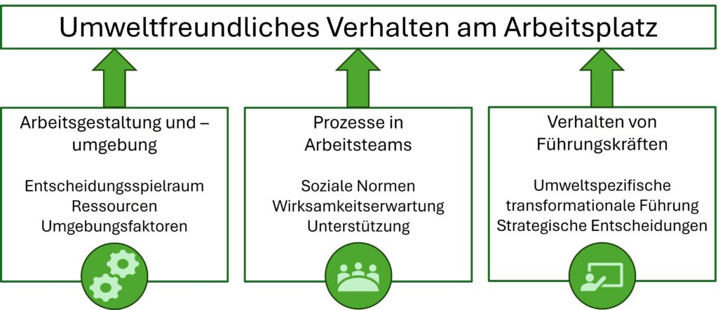 Das bedeutet allerdings nicht, dass die Verantwortung allein bei den Mitarbeitenden liegt. Umweltfreundliches Verhalten am Arbeitsplatz wird maßgeblich durch die Gestaltung von Arbeitsaufgaben, -prozessen und -umgebung sowie durch soziale Prozesse in Teams und das Verhalten von Führungskräften beeinflusst.