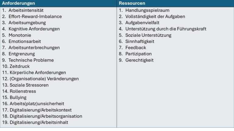 - Ergebnis: Bestätigung der 28 Dimensionen (19 Anforderungen, 9 Ressourcen), welche jeweils mit 3 Items erfasst werden können
